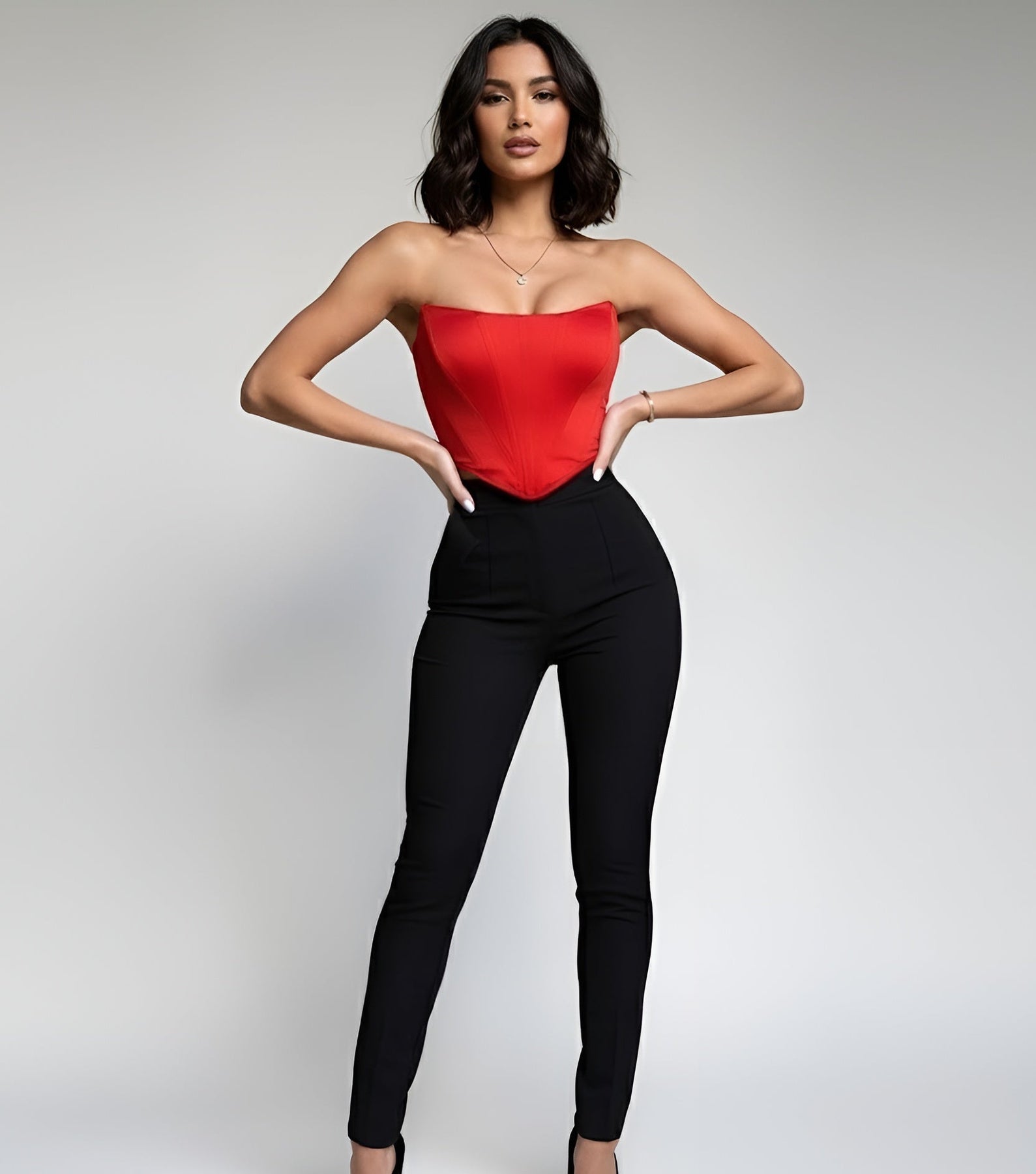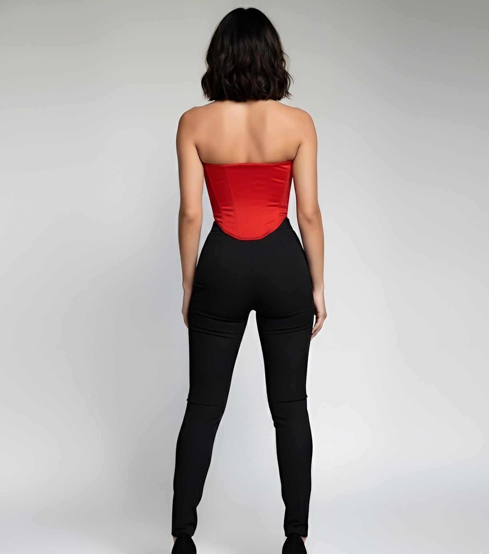 Crafted from soft, rich velvet, this top features a flattering off-shoulder design that beautifully frames the décolletage. The boning adds a perfect, waist-cinching fit, while the backless cut ensures an unforgettable exit.
